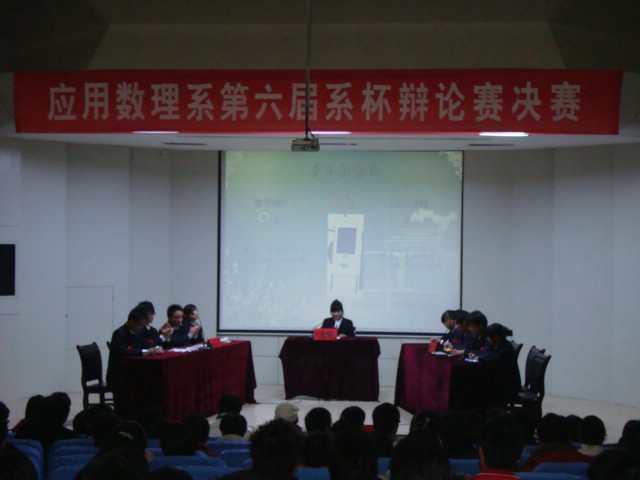 2009年12月6日,应用数理系第六届“系杯”辩论赛决赛在学术报告厅隆重举行。各兄弟系辩论赛最佳辩手应邀担任本次比赛的评委,应用数理系党总支副书记水心宝,团总支副书记梁雪松和各系学生会主席观看了比赛。