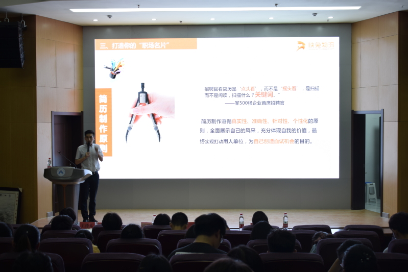 快兔公司人力资源部负责人陈泽鹏先生以 “如何提升你的职场简历”为主题,指导同学们提高自己的简历制作,以丰富的专业知识和实践能力充实自己的简历。向同学们介绍了面试的环节,以及面试中应注意的问题。讲座中他结合案例就同学们在毕业后选择就业还是创业,给出了合理建议。