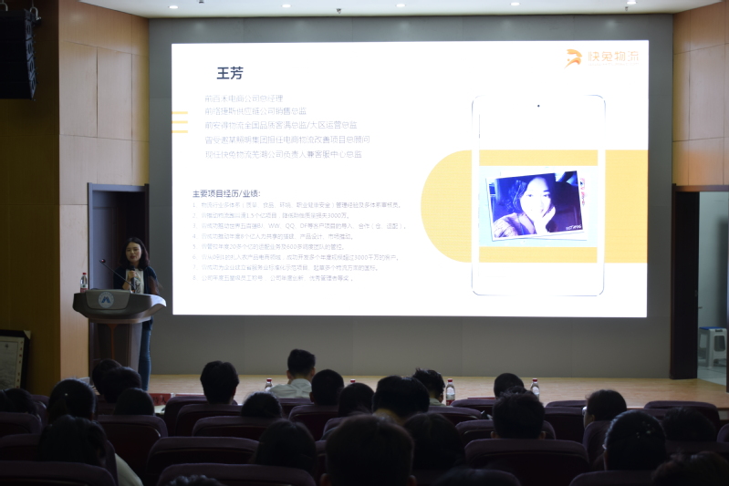 芜湖快兔公司负责人王芳女士首先做了报告,通过案例向同学们展示了物流企业的基本工作内容,结合自己的工作,同学们分析预测了物流行业的前景,就物流工作的实际问题和同学们展开交流。