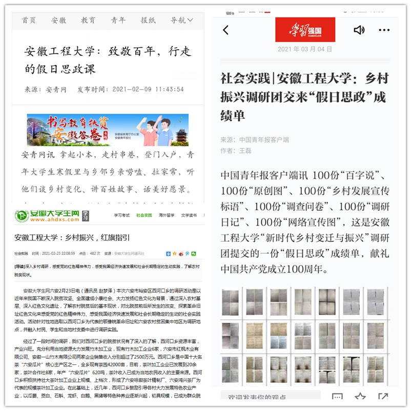 近日,以“百年乡村变迁与乡村振兴发展”调研团为代表的人文学院“致敬百年”网络主题教育活动经验做法先后在学习强国、中国青年报、安青网、安徽大学生网等主流媒体上报道。