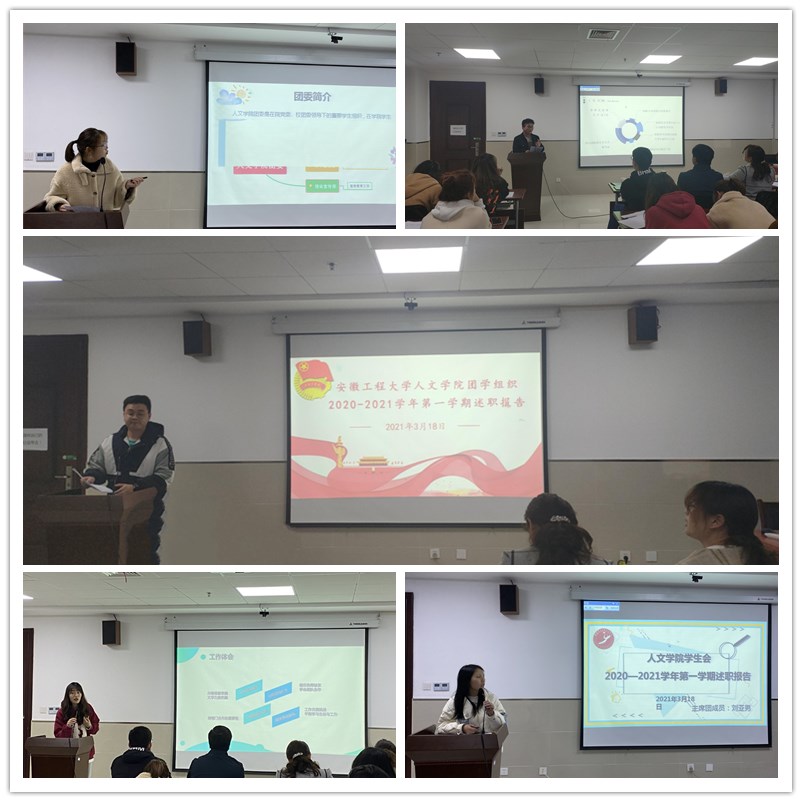 在简述述职会评议规则后,团学负责人和各部门负责人依次上台以PPT展示+演讲形式对过去一学期工作进行了回顾、总结、评价和对本学期工作进行了计划和展望。院团委副书记唐叶婷首先介绍了团委上一学期的工作,对不足之处做出反思,并有“不忘初心,稳扎稳打,迎难而上”来勉励后期的工作。院团委副书记青媒中心负责人陶诗妍则简洁凝练了学院青媒今后工作的着力点,提出要打造实时性、创新性、趣味性、高效性的高校综合新媒体平台。院学生会主席团代表刘亚男就上学期的学生会的工作进行了总结,指出了工作的不足,后期将不断提高学生会的组织能力和服务意识,更好地服务我院学生。紧接着各部负责人依次进行部门述职报告。