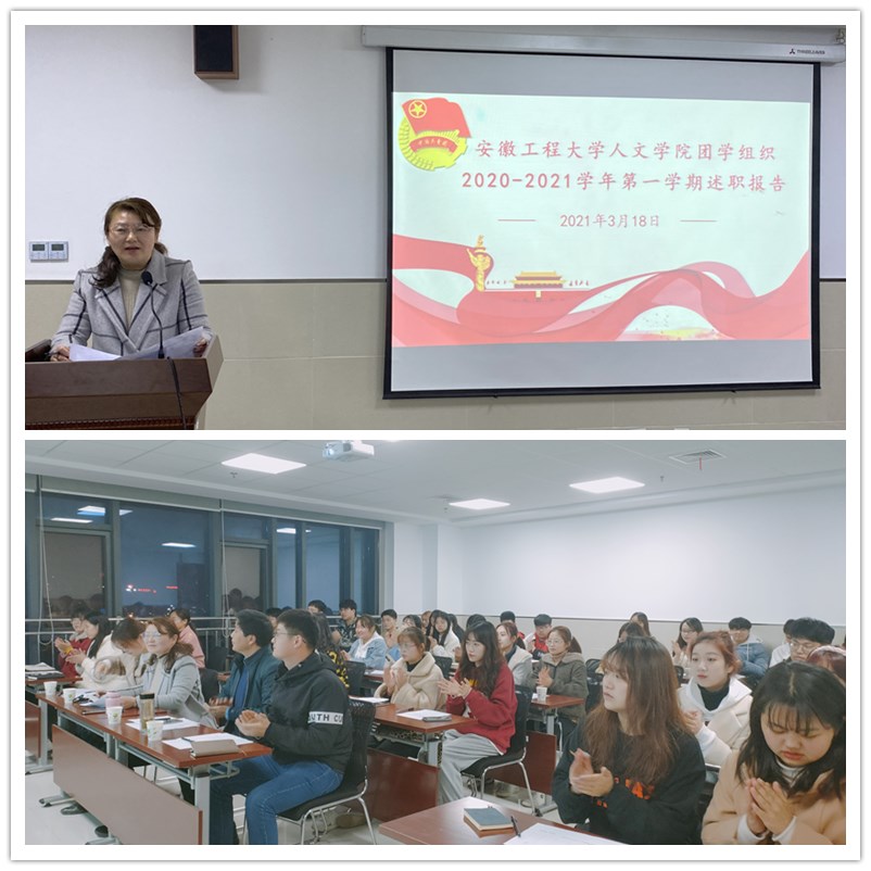人文学院团学组织述职评议会议于3月18日晚上在图书馆1207会议室举行。学院组建以学生代表为主,党委副书记金艾裙、学院副院长周伟、团委书记、辅导员代表共同组成的学院团学组织评议会对学院团学组织进行评议打分。述职会由学院学生会主席团成员江周主持。