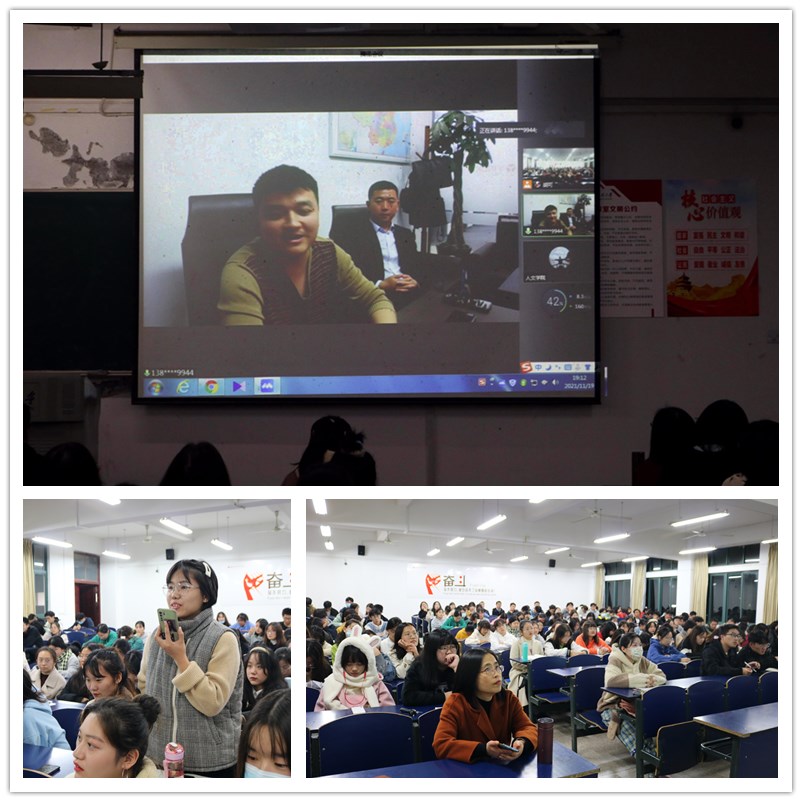 为进一步深入学习贯彻习近平法治思想,提高学生的法律素养,指导学生生涯规划,提高人才培养质量与就业质量,人文学院线上校友大讲堂于11月19日晚在上6教113举行,特邀2014届法学专业杰出校友、任合肥市瑶海区市场监督管理局公职律师、兴市场监督管理所副所长储涛和北京市盈科律师事务所(合肥分所)胡鹏飞作报告,法学专业全体学生参加校友大讲堂,校友大讲堂由法学系主任杜蓓蕾主持。