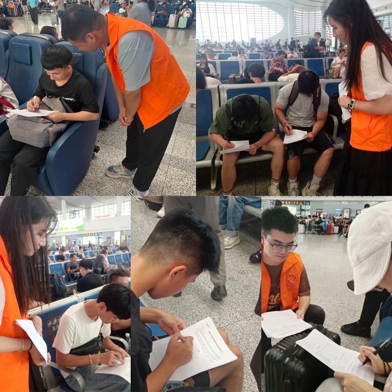 首先,团队穿梭于售票厅、候车大厅进站口、出站口等区域车站的安全性、功能性和便民性进行调研考察通过与工作人员的交流,团队了解到,暑运以来,学生、旅游客源集中释放,出行需求主要以旅游度假、对公商务、探亲访友为主,车站不断迎来客流高峰。如何在满足客出行需求的前提下,有效提升车站的客运能力、服务品质,从而应对暑运客流高峰、确保暑期客运输工作安全有序是团队思考的问题。接着,团队来到候车大厅,不同年龄段的乘客发放车站服务质量及乘客服务需求调查问卷,并对候车客进行了采访调研过程中,共发放收集调查问卷100余份团队成员认真记录并耐心地为客答疑解惑提供帮助,收获了乘对于本次实践活动的肯定赞扬以及宝贵的建议。