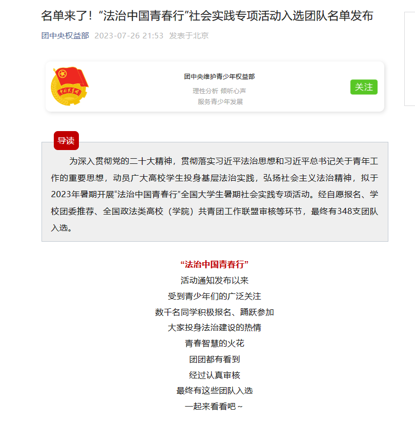 我校五支团队入选团中央2023年“法治中国青春行”社会实践专项活动实践团队