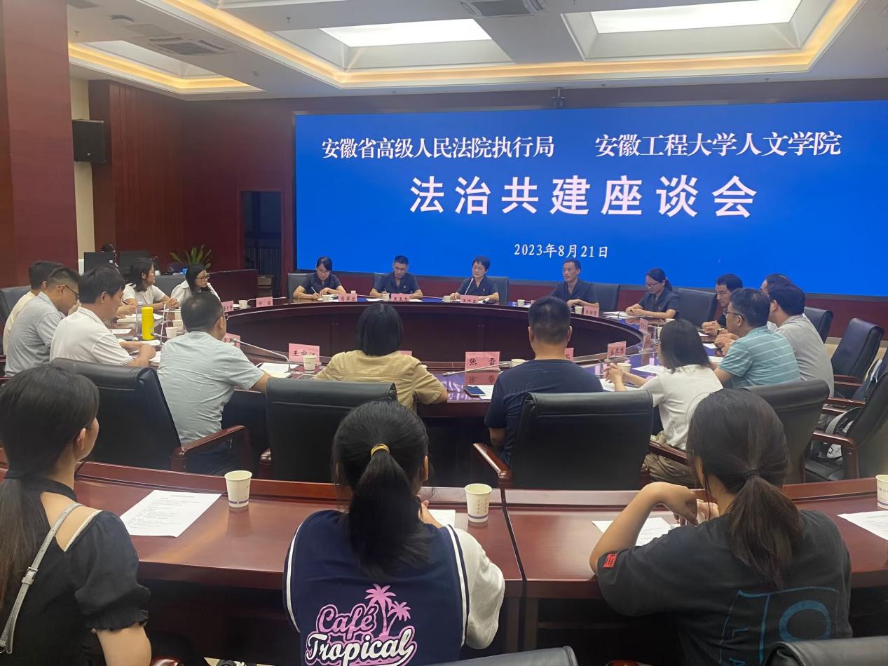 为进一步发挥法治宣传教育在法治建设中的基础性作用,落实“八五”普法规划,建设更高水平法治安徽,8月21日,由人文学院法学等专业学生、校法律协会学生组成的三支暑期法治实践队,在人文学院法学系教师带领下,赴安徽省高级人民法院执行局开展法治共建。安徽省高级人民法院执行局副局长王怀正,执行指挥中心主任何军,安徽省人大代表、校教务处副处长贾文友,人文学院党委副书记王中江参加共建活动。