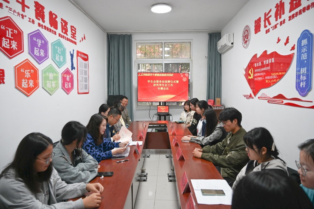 为认真落实《关于推动高校学生会(研究生会)深化改革的若干意见》,推深做实“三全六专”育人实践,完善党委领导、团委指导工作机制,推进“让优秀的同学服务同学、感染同学、引领同学”落到实处,坚持“权益进宿舍”,提高培养质量,10月25日,人文学院在和谐社区工作站“师生午餐畅谈室”召开“青年之家”学生会服务站挂牌仪式暨研究学生会工作专题会议。人文学院党委副书记王中江、学生会主席团成员、学生会权益部代表、“十佳宿舍创建”活动获奖宿舍代表参加了本次活动。活动由学院团委副书记利昕云主持。