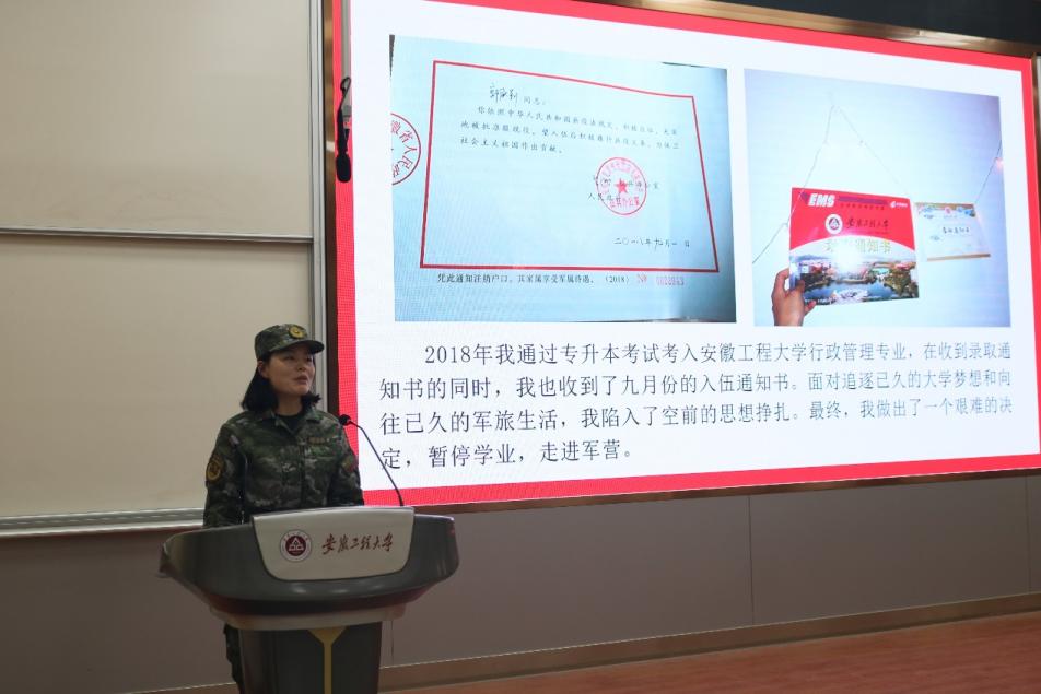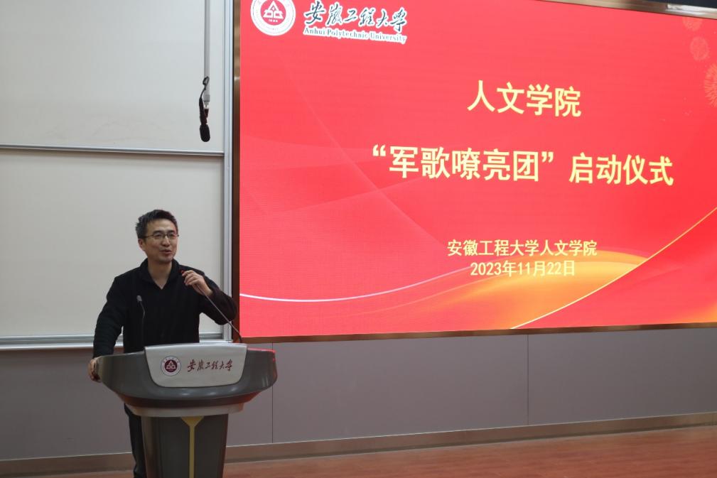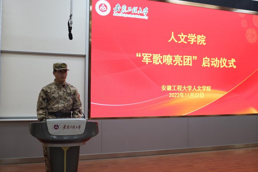 活动在庄严的国歌声中拉开序幕,师生精神饱满,壮怀激昂。首先,利昕云宣读《人文学院“军歌嘹亮团”项目方案》,介绍了工作任务、内设机构、具体职责、组织保障,重点阐述了“军歌嘹亮团”的“9个1工作职责”。接着,王中江宣读“军歌嘹亮团”成员名单,并一一介绍成员的简要情况,鼓励退役复学大学生不负韶华,接续奋斗,努力实现从“国防卫士”向学校“发展生力军”的转变。