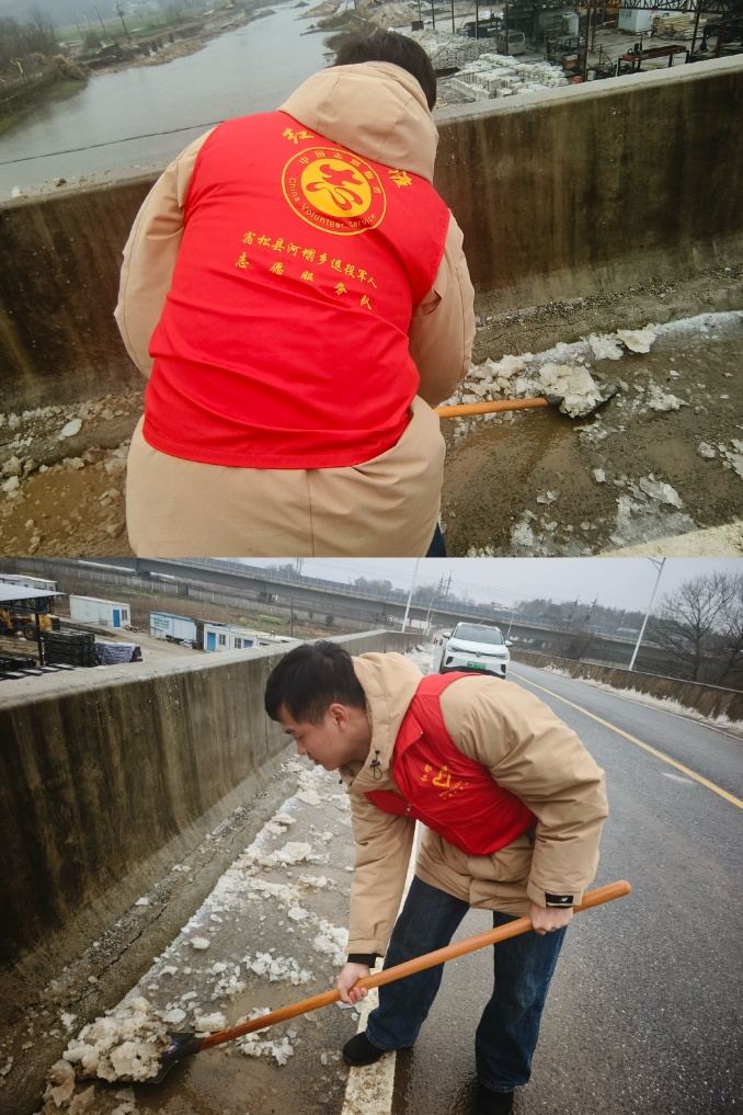 2月8日,在安庆市宿松县河塌乡,法学212贺行郑主动申请加入当地退役军人志愿服务队,疏导交通、排查道路交通安全隐患,全力以赴地投入到抗冰雪、保安全、保畅通工作中。