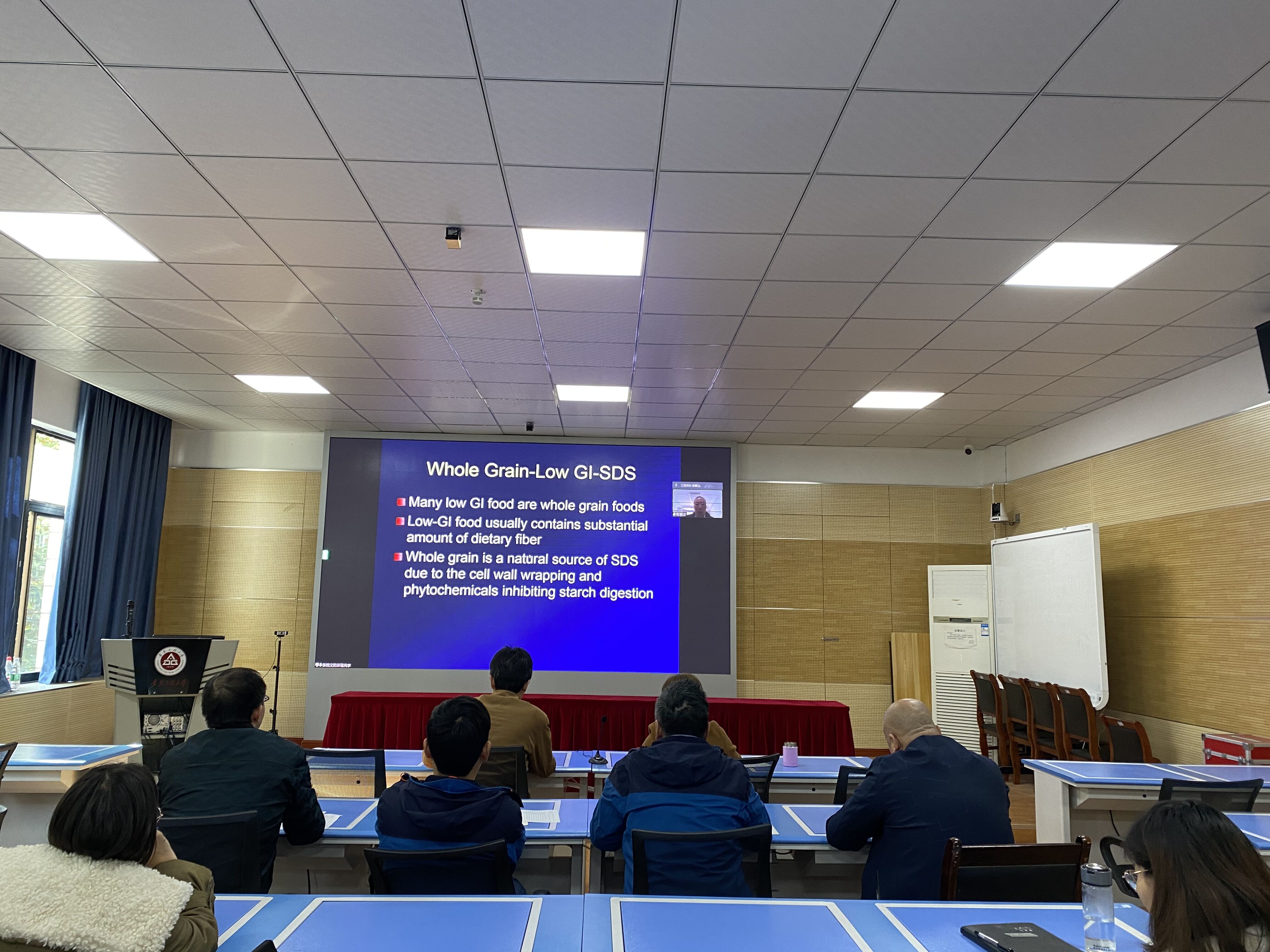 张根义教授的报告题目为“全谷物态慢消化淀粉的结构和健康效应”。张教授从事着全谷物食品的研究,他在报告中阐明了他是如何创新性地制备了以淀粉包埋为基础的拟谷粒体,并把拟谷粒体作为全谷物食品研究的模型;同时就拟谷粒体的构建不仅实现了淀粉的慢消化,而且也具有明显的健康功能进行了报告和交流。