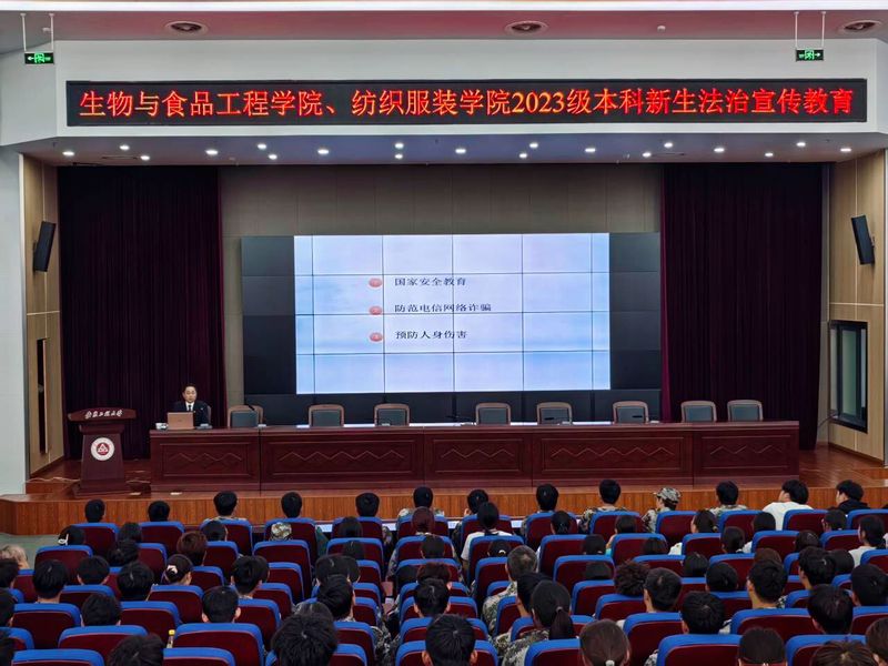 为进一步加强大学生法治教育,提高大学生法律意识,9月24日下午,芜湖市经济技术开发区人民法院员额法官俞泽迪作为受邀嘉宾,在图书馆报告厅为生物与食品工程学院、纺织与服装学院2023级新生带来一场精彩生动的法制宣传教育课。纺织与服装学院党委副书记梁雪松、生物与食品工程学院党委副书记王彦青、新生辅导员以及300余名新生们参加活动。活动由王彦青主持。