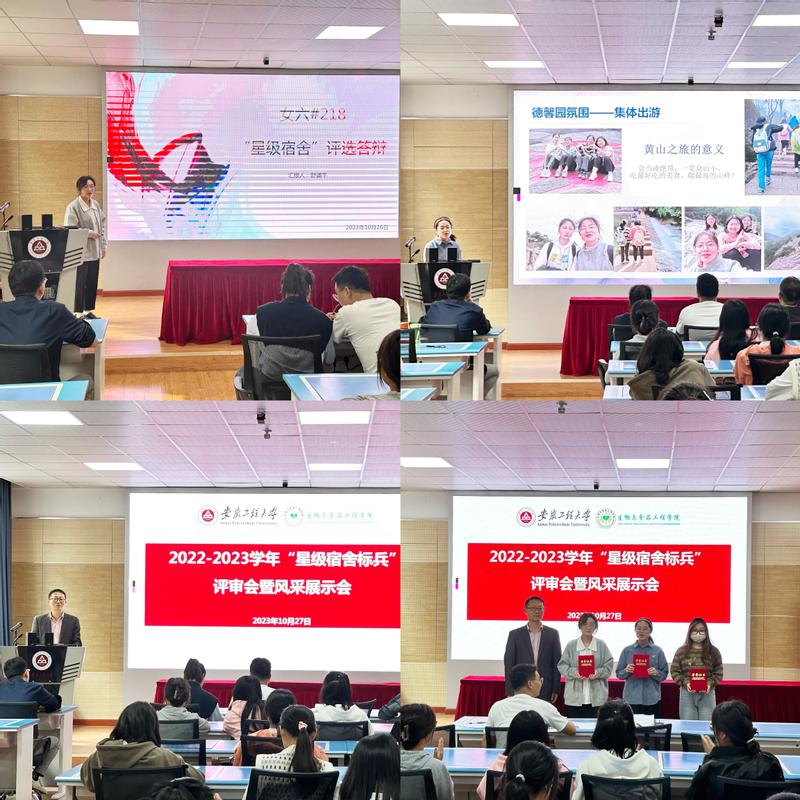 星级展风貌,标兵树榜样,2022-2023学年“星级宿舍标兵”评审暨风采展示会成功举办。经宿舍申报、班级推荐、辅导员审核的来自三个年级的6个实力宿舍,围绕成员风采、宿舍环境、学业学风、特色文化等方面进行展示,分享宿舍成员自入校以来的成长与收获,充分展现了生食学院学子的青春风采。此次评审会共推选出三个星级宿舍标兵参评学校的三星级宿舍评选。生工231吴悦同学观看后说:“学姐们所在的宿舍不负青春、奋发向上,一份份精彩的履历,是他们给自己、给宿舍的一份份完美答卷,更是我今后学习的目标。”