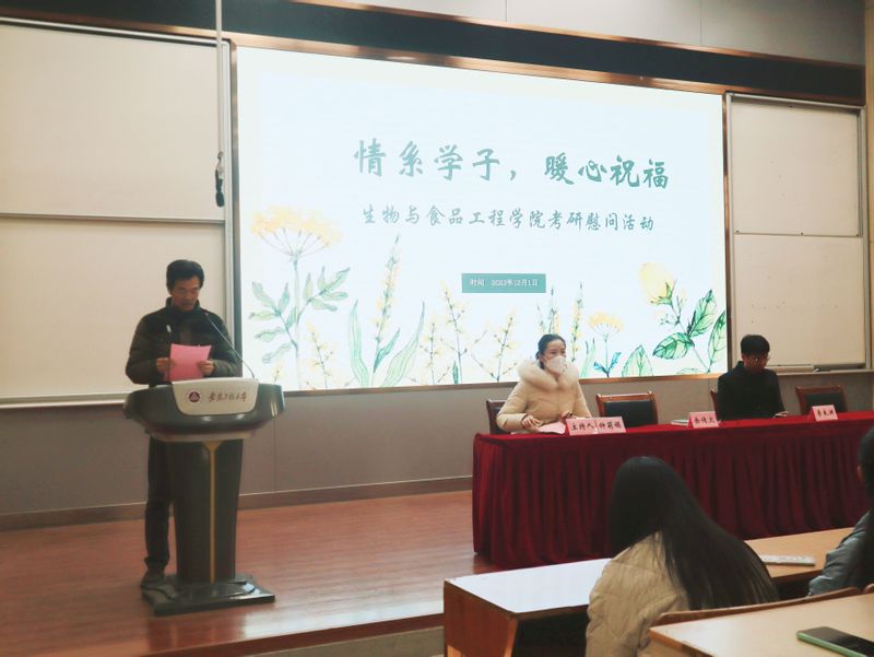 为缓解考研学子压力,坚定考生冲刺信心,12月1日上午,生物与食品工程学院在2教报告厅举办了“情系学子 暖心祝福”考研慰问主题党日活动,学院党委书记余传文、辅导员李良渊及2024届全体考研备考生出席参加本次活动。活动由毕业班辅导员钟莉娟主持。