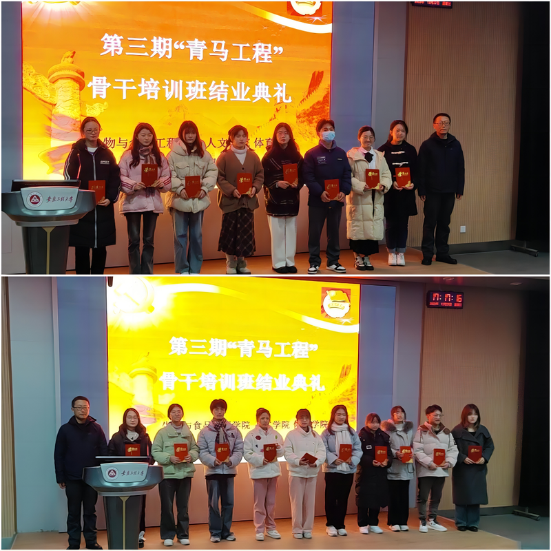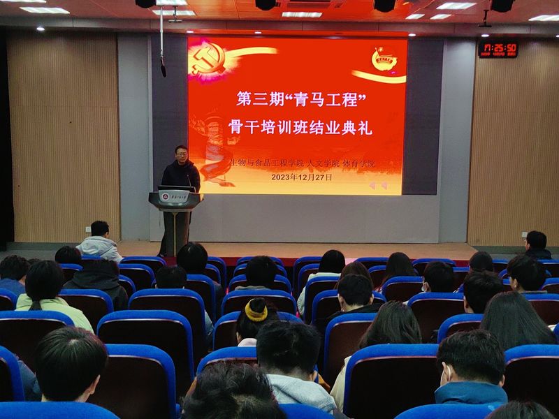 为进一步提高大学生骨干的思想政治素质,更加坚定跟党走中国特色社会主义道路的信念。12月27日,生物与食品工程学院、人文学院、体育学院在5J117联合举办第三期“青马工程”骨干培训班结业典礼,生物与食品工程学院党委副书记王彦青、部分辅导员以及近70名学员参加结业典礼。
