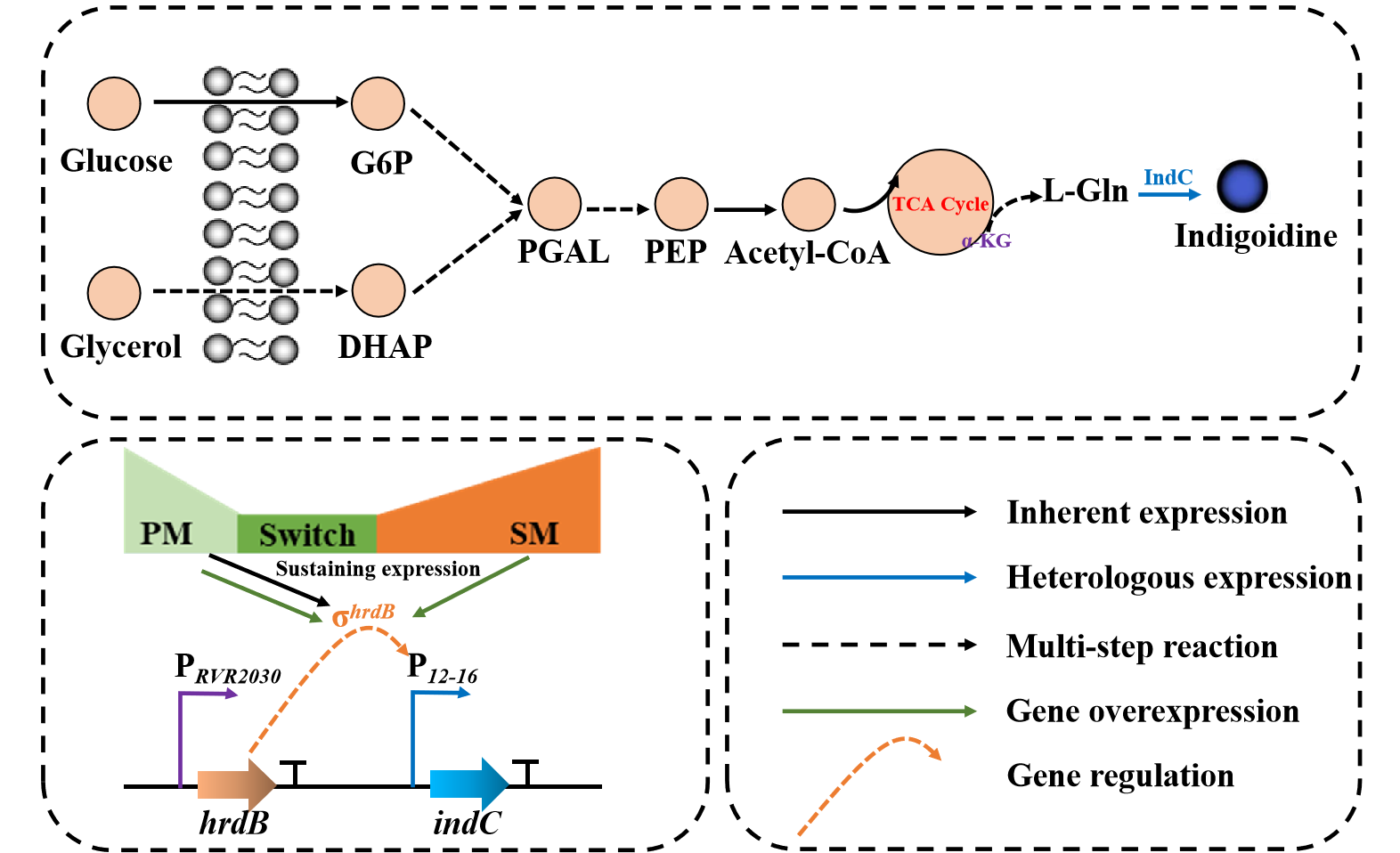 靛蓝是目前人类所知最古老的色素之一,也是应用于纺织印染行业最古老的染料之一。在历史的长河中,靛蓝的生产方式从古代的植物浸泡到近现代的化学合成,并逐步进入生物合成时期。靛蓝主要由L-谷氨酰胺经靛蓝合成酶缩合反应合成,靛蓝合成酶 IndC 大部分来源于链霉菌属。然而,链霉菌代谢开关在不同代谢阶段存在时空差异,因此全面优化其生产力是一个挑战,这使得链霉菌难以生产低附加值的大宗化学品。因此,大部分研究人员选择在异源宿主如大肠杆菌、谷氨酸棒杆菌等中过表达 IndC,以实现靛蓝的高水平生产。