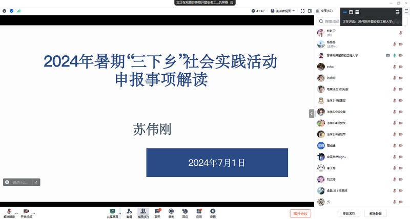为深入学习贯彻习近平新时代中国特色社会主义思想和党的二十大精神,引领广大青年学子在社会实践中“受教育、长才干、做贡献”,7月1日,生物与食品工程学院联合人文学院召开2024年暑期“三下乡”社会实践线上动员会,校团委副书记周海林、两个学院团委主要负责人、辅导员代表及学院“三下乡”社会实践团队成员近100人参加本次动员会。