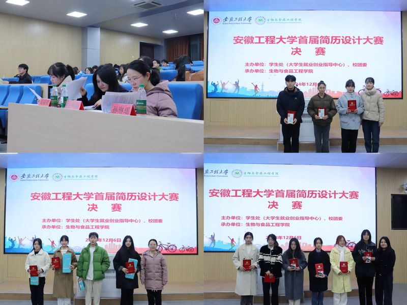 12月6日,由我校学生处(大学生就业创业指导中心)和团委主办,生物与食品工程学院承办的校首届简历设计大赛决赛在5J217教室举行。经现场评审,设计研24王君等3名同学获得一等奖,计算机拔尖221张结婷等4名同学获得二等奖,人力231许雅晨等5名同学获得三等奖,营销221巫勤雯等8名同学获得优秀奖。